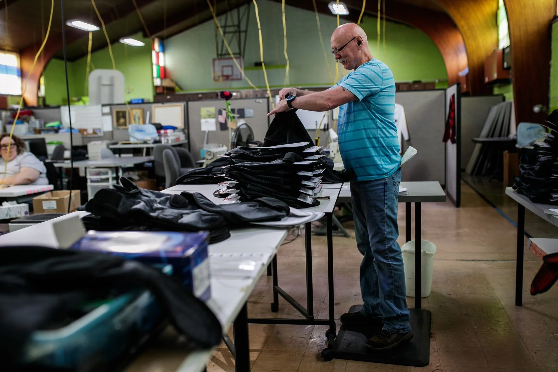 In 2015, Stormy Kromer knew they needed to increase their sewing capacity, and happened upon the St. Luke N.E.W. Life Center. The relationship grew, and our very own Sister Carol and six of our seamstresses spent a week at their factory in Ironwood, Michigan, working hand-in-hand with the engineers and sewing trainers to learn their products. Since then, we have been individually hand-crafting vests for this amazing brand on our industrial sewing machines. We produce around 360 vests each month, and those made here receive an additional tag, so customers know where it came from.